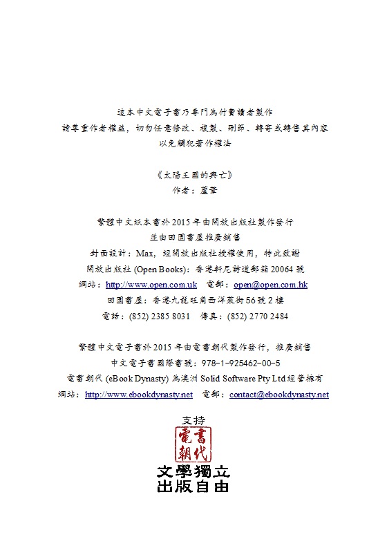 敬告讀者:《太陽王國的興亡》中文紙本書已由香港開放出版社製作發行,並由田園書屋推廣銷售。有意購買的讀者,請循下方版權頁提供的資訊直接洽詢。謝謝。