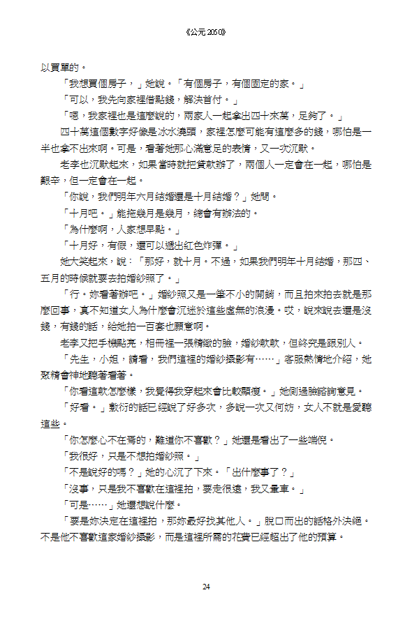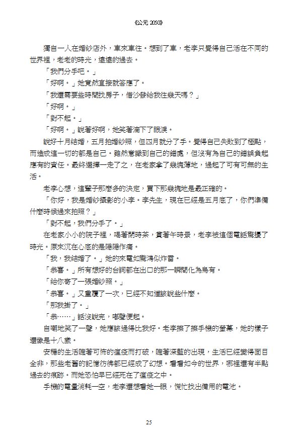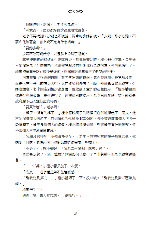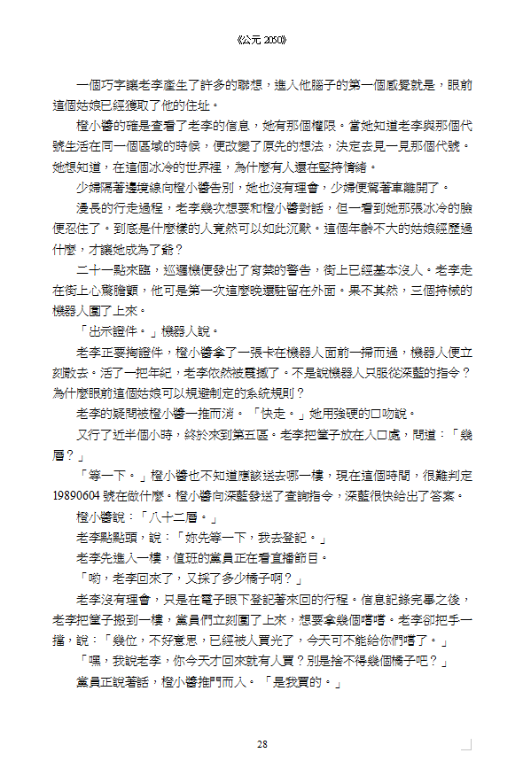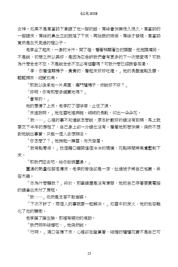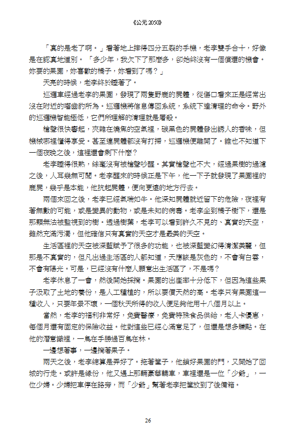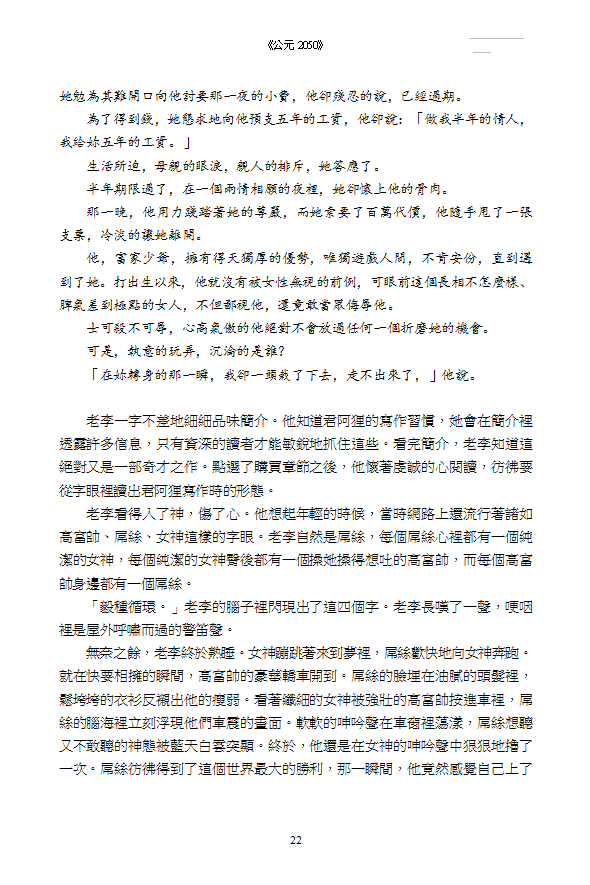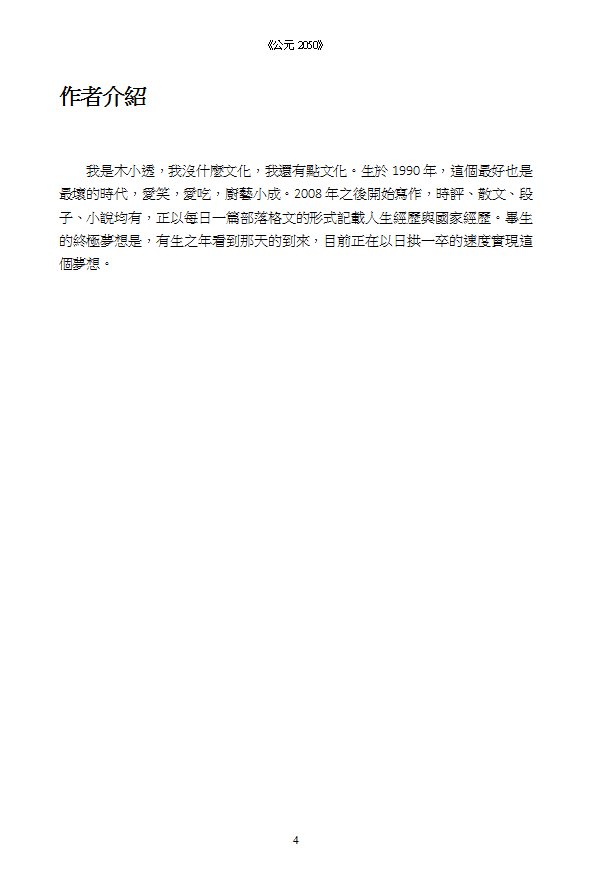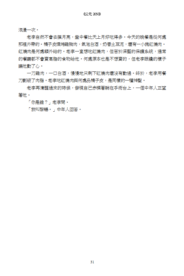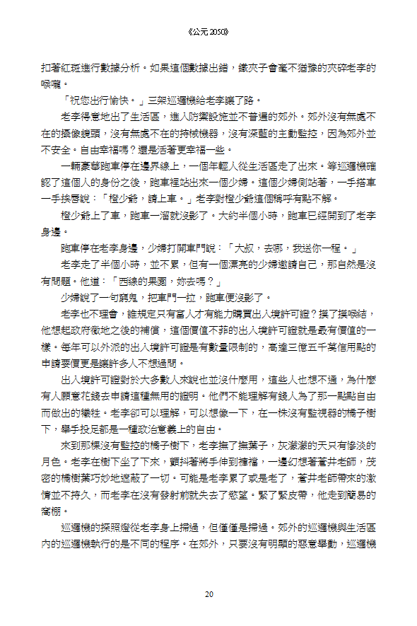 「《公元 2050 年》是一部不可多得的傑作,如果和《角》配合著看,就能體會作者木小透淡淡文字之下的痛心疾首。他的字裡行間透露著直白,感情深刻,卻以最為『事不關己』或『漠不關心』的形式表現出來,讓讀者在同情憐憫之餘更能心生敬意,為書中人物或成功、或失敗的奮鬥說一聲讚,給一點安慰。正是作者和筆下七個主角的這段距離,讓讀者感受到作者已經把他們看透了,看實了,更把他們看出一種真切的存在,在無言之中又聲嘶力竭地為他們大聲怒吼而抱不平。」... 繼續閱讀