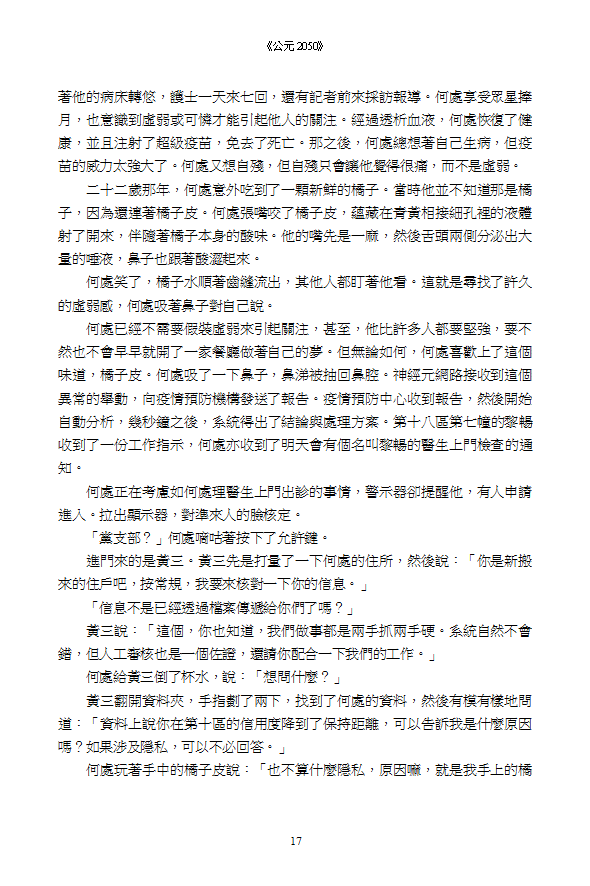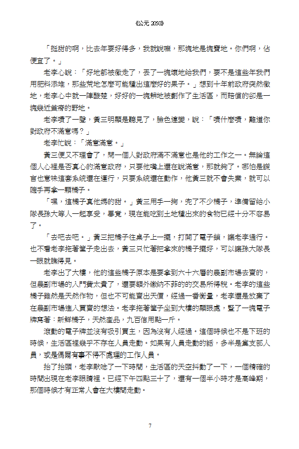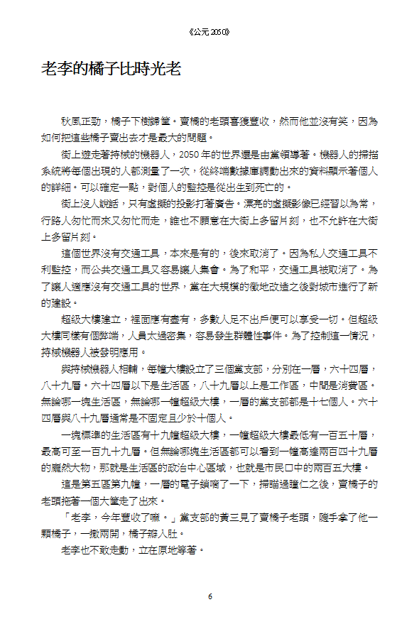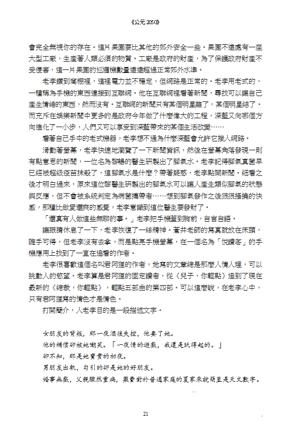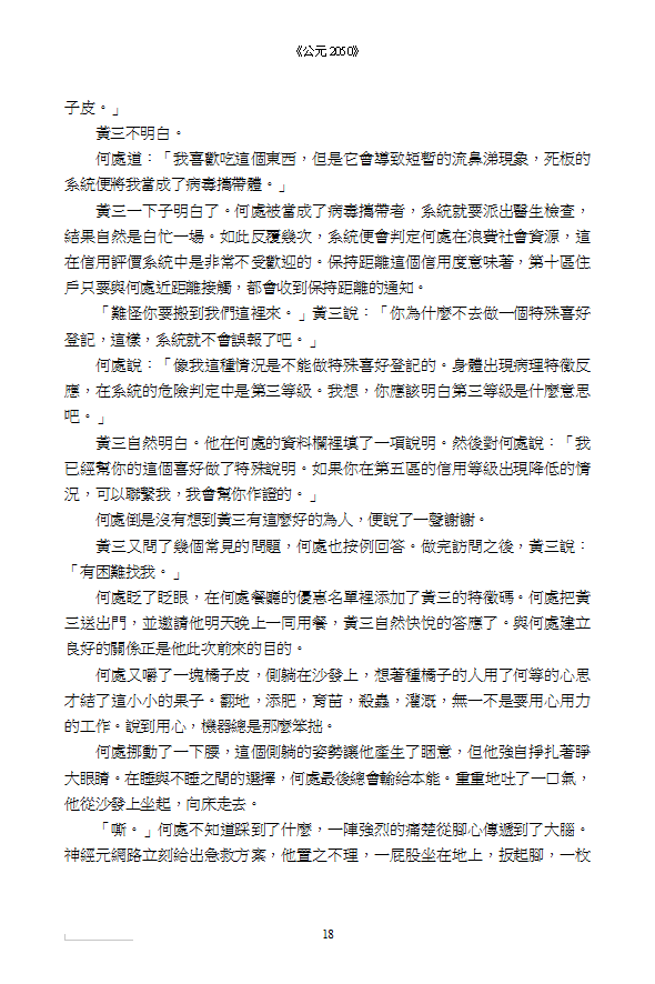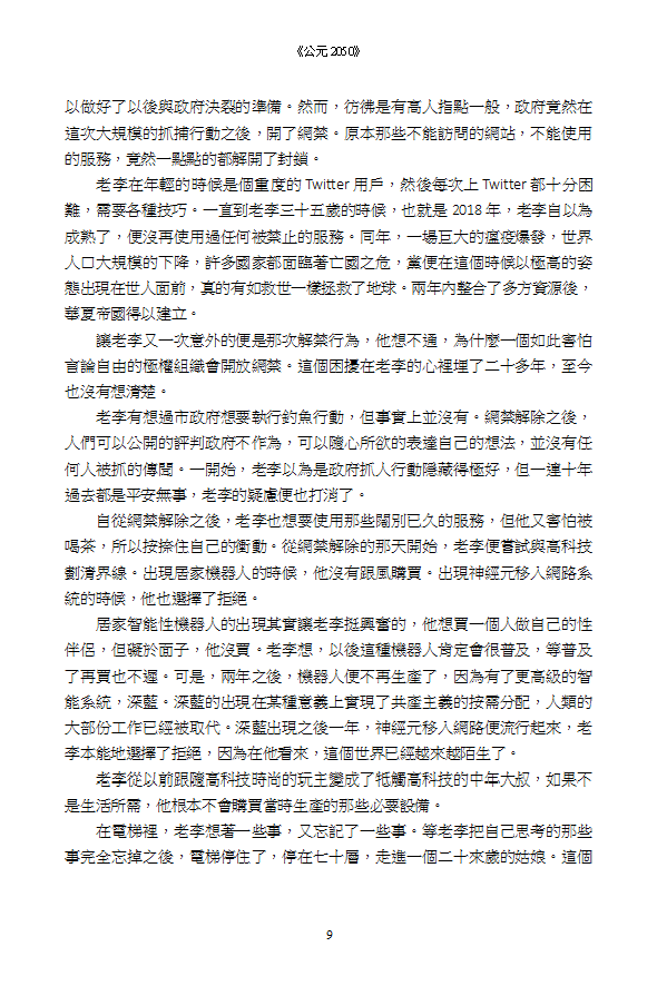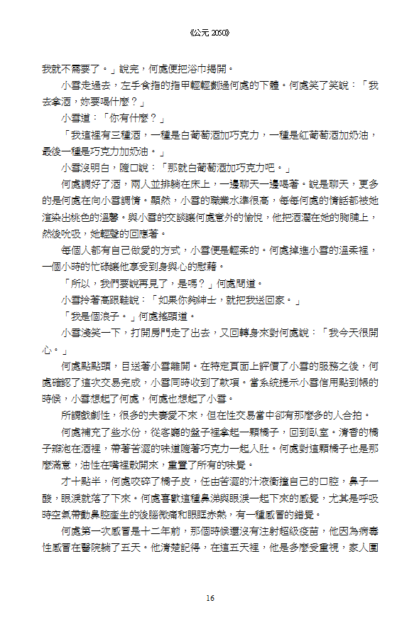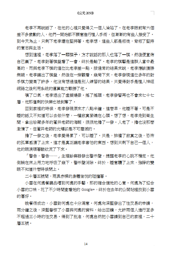 公元 2050 年,中國已經不存在,取而代之的是世界歸心的華夏帝國,黨和政府也開放了網路,任何人都可以出言批評。超級疫苗的發明讓人們沒有疾病,無須懼怕死亡,神經元網路的植入讓人們彼此可以自由溝通,虛擬世界可以滿足一切,連性交易都合法化了。超級大樓的林立讓人們足不出戶也可以享有一切,每天只在樓層之間穿梭,要什麼有什麼。