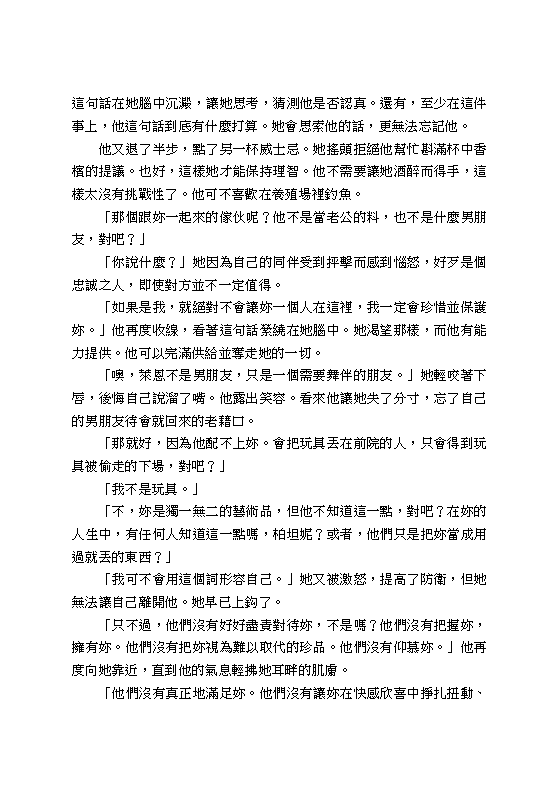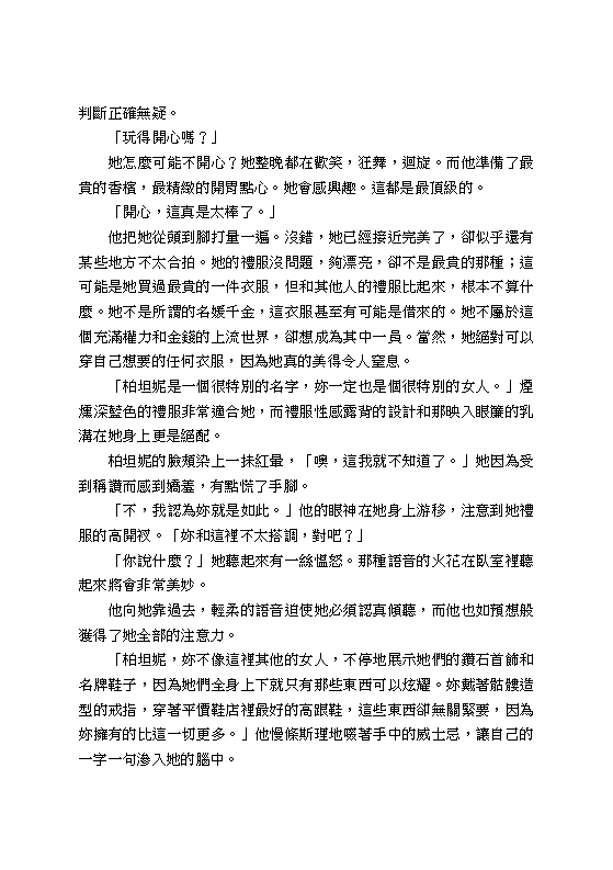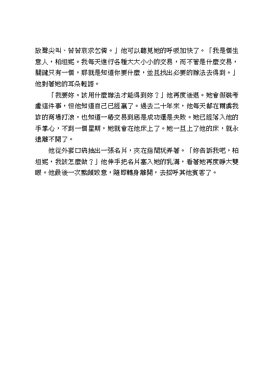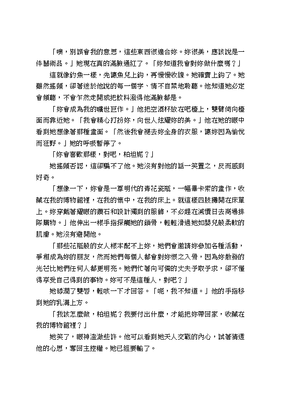 柏坦妮是蓋瑞特的獵物,他有魅力、地位、金錢,然而更重要的是,他能給她的性愛快感,是她所交往過的其他男人所不能提供的。