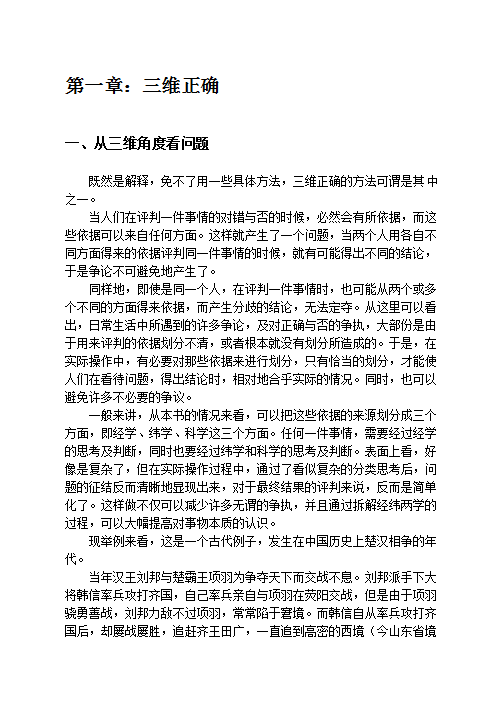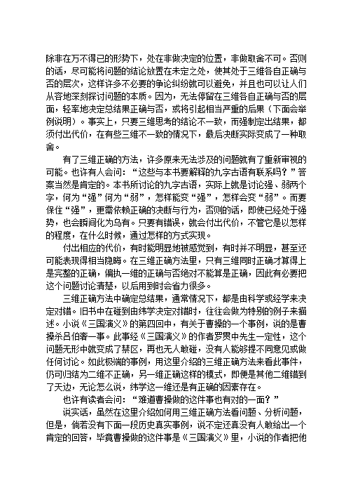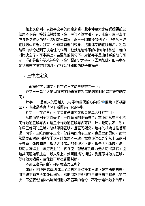 在数学中,我们以 x 轴、y 轴、z 轴来表示三维。在现实世界中,我们以南、北向和高度来表示三维。本书作者尝试以学术的经学、纬学、科学来解释第一类强大的三维。凡事件发生,其成败取决于其状态、形势,而随时间的变化,状态因而变化。事件的格局越大,状态处置的对错,影响全局结果的比重也随之加大,有时会大到凌驾其他二维的对错,而成为关键因素。