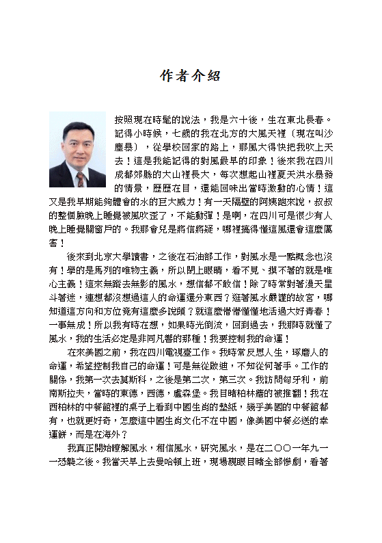 筆名水風居士的美籍華人實名叫徐華峰,畢業於中國北京大學和美國喬治華盛頓大學。現居美國新澤西州的水風居士已經在美國生活了二十二年。他的主業是高級計算機數據庫管理諮詢工程師,也是資深的美國房地產經紀人。他還是資深的美式風水的研究員和推廣人。... 繼續閱讀 |