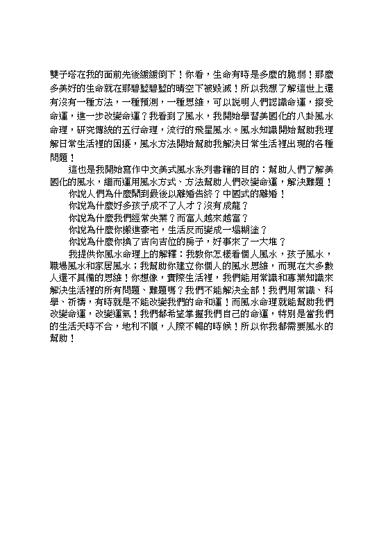 有鑑於父母和子女兩個世代之間的不同,《美式孩子和教育風水問》與其說是要教讀者如何問風水、看風水,不如說其用意在於提醒父母親不要畫地自限,既然身在海外,面對各種新挑戰和新觀念,對於子女的傳統保守態度就難以保留,反而必須用新的角度,採取新的方式來解決兩代之間的問題。父母必須進一步了解孩子求學交友的環境,與其說是用風水來測算吉凶合剋,不如說是身體力行,付出真切的關懷和體諒。正如風水輪流轉的道理,人也不能僵化,特別是在海外,特別是面對自己最親最愛的子女。... 繼續閱讀 |
