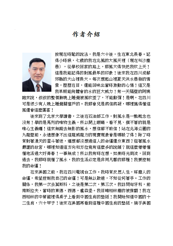 筆名水風居士的美籍華人實名叫徐華峰,畢業於中國北京大學和美國喬治華盛頓大學。現居美國新澤西州的水風居士已經在美國生活了二十二年。他的主業是高級計算機數據庫管理諮詢工程師,也是資深的美國房地產經紀人。他還是資深的美式風水的研究員和推廣人。... 繼續閱讀 |