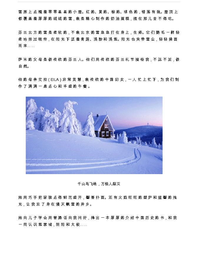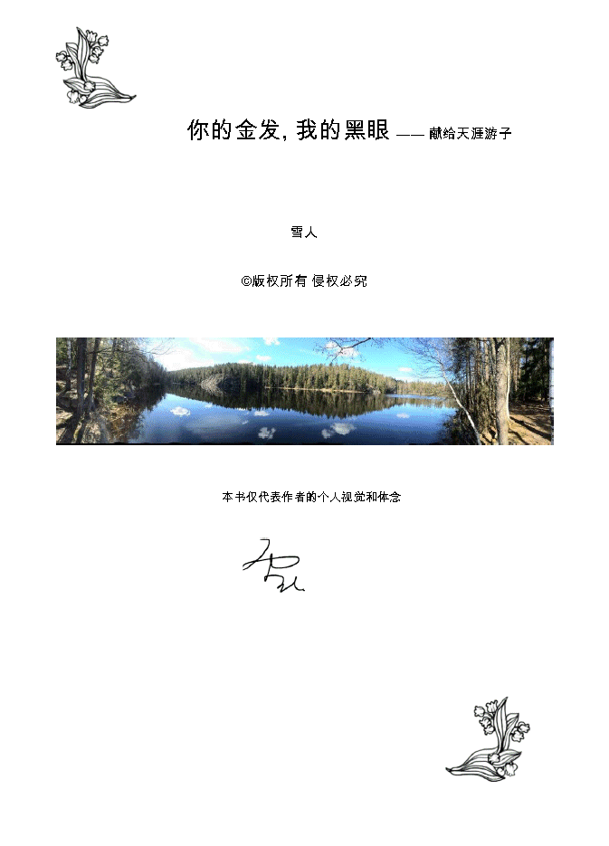 雪人,带着北欧的清新自然之风来到读者面前。她的文章宛如山间清泉,未经污染,清清爽爽流入读者心田。雪人的文字柔婉清丽,字字珠玑,对自然景物的描写出神入化,每篇文章都可找出经典之笔。