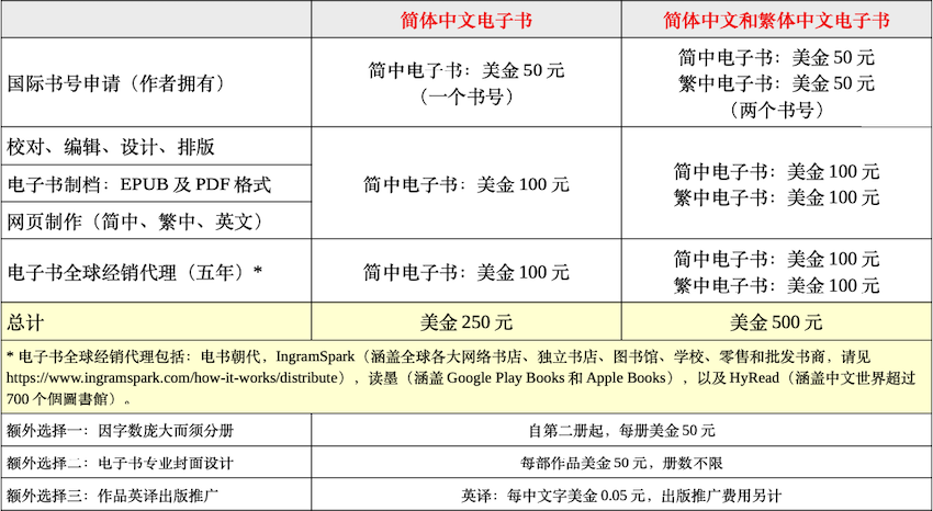 您可以选择只出版简体中文电子书,或同时出版简体中文和繁体中文的电子书。无论您的选择为何,我们都会为您建立简体中文、繁体中文和英文的推广网页,并通过电书朝代网站和美国随需出版平台 IngramSpark、台湾 EPUB 中文电子书服务平台读墨、以及台湾中文电子书和图书馆服务平台 HyRead,将您的电子书推广至中文世界各个角落。