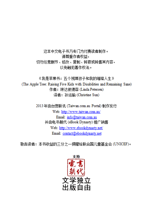 敬告读者:本书收益的三分之一捐赠给联合国儿童基金会 (UNICEF),余额则全数转交作者,电书朝代不收分毫。 |