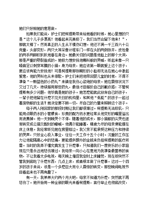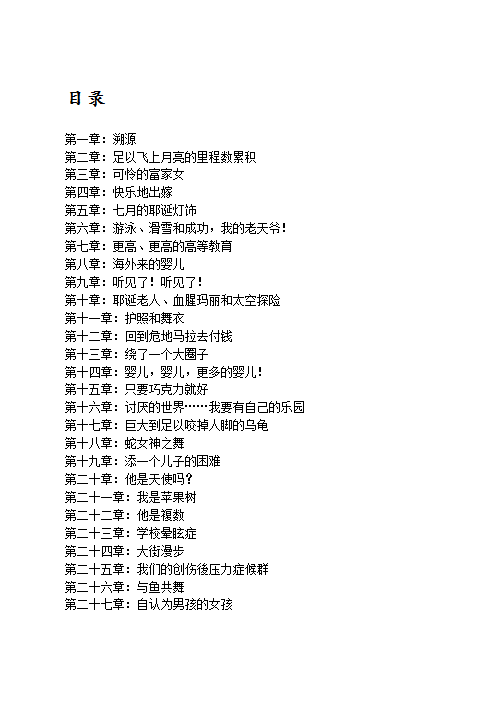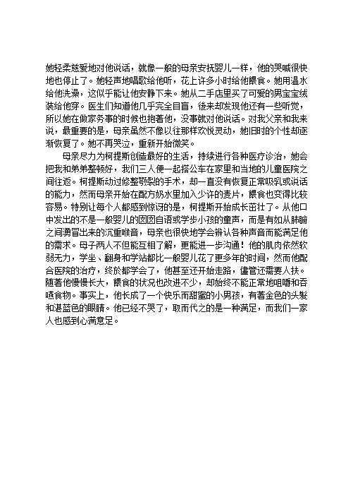 六个月大的男婴金发蓝眼,却看不见自己的母亲。五个月大的女婴来自危地马拉,棕色的大眼睛仿佛随时都在微笑,却听不见母亲的声音。六岁的男孩肤色黝黑,有着一头黑色的漂亮卷发,却总是躲在一盆假树后面,不肯和家人一起吃圣诞大餐。西班牙裔男孩面对母亲的欢悦笑容迅速转变成愤怒的瞪视,掩藏了内心的忧郁病症。七岁的女孩娇弱细致,却不爱自己的母亲,更无时无刻不提醒后者这个残酷的事实,而且是用手语说的。